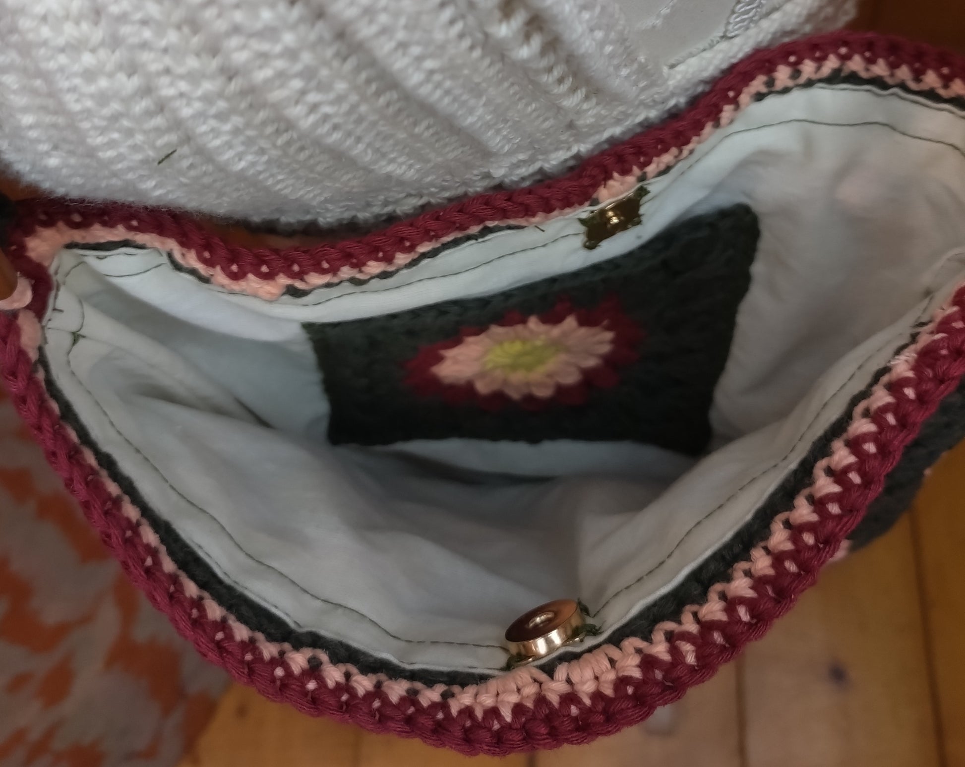 Ce sac tote bag unique, Composé de carrés granny aux couleurs doux et vibrantes (rose corail, bordeaux, vert foncé), il est 100% en coton recyclé pour un accessoire éco-responsable et durable.